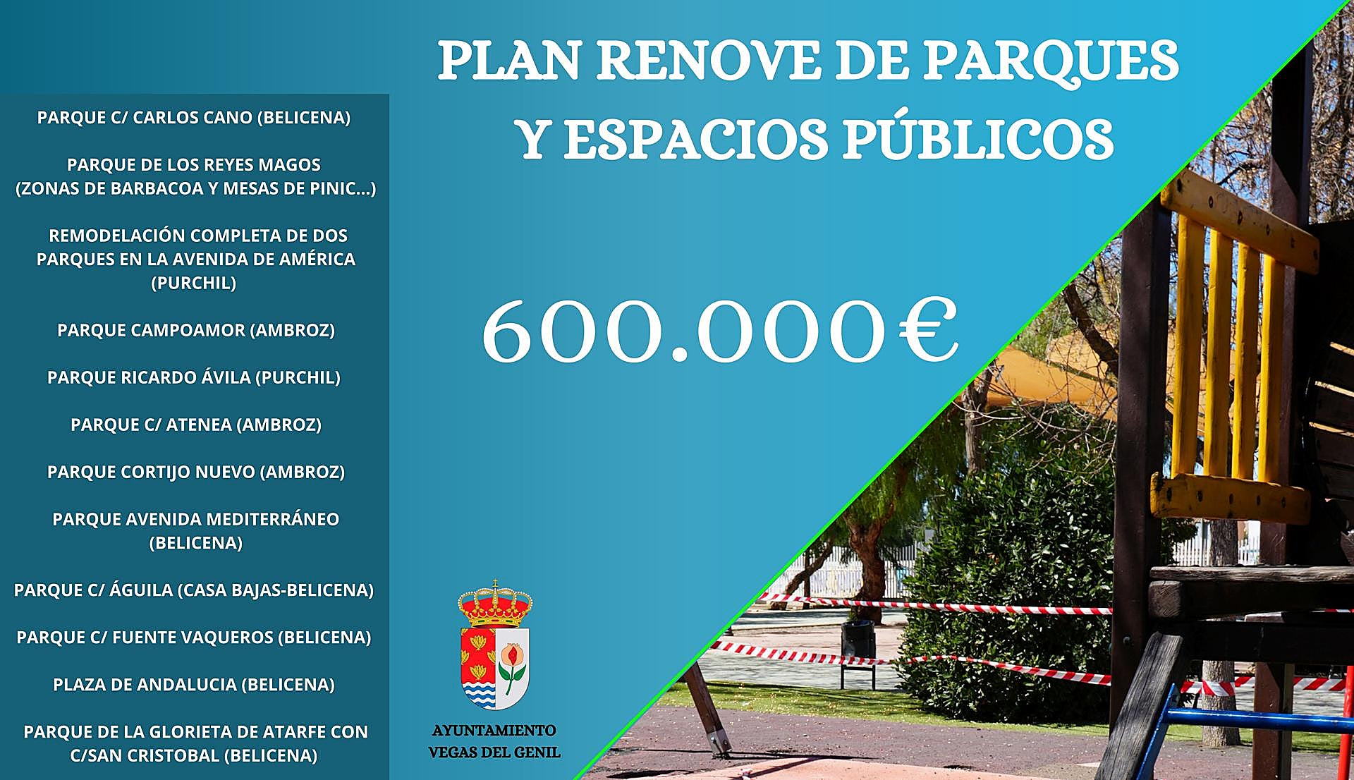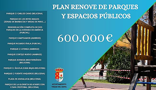 El Ayuntamiento de Vegas del Genil ha presentado su nuevo Plan Renove de Parques y Jardines, un ambicioso proyecto de transformación de las zonas ... verdes del municipio, que supondrá una inversión total de 600.000 euros, financiados por el Ayuntamiento en colaboración con los Planes Provinciales de la Diputación de Granada.