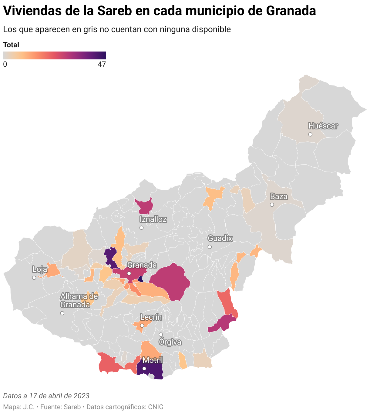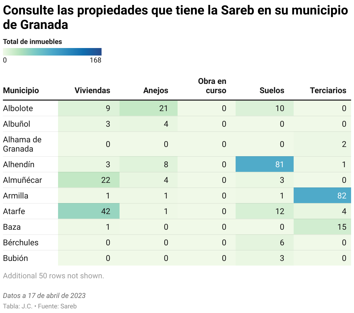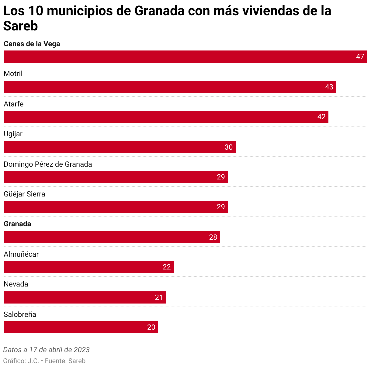En Granada esta sociedad posee actualmente 534 viviendas, distribuidas entre la capital (28) y 48 municipios. En algunos puntos están concentradas ya que localidades grandes como Cenes de la Vega y Atarfe, en el Área Metropolitana, o Motril, se aproximan cada una al medio centenar de viviendas que fueron rescatadas para la Sareb. Llaman la atención las 29 de Dúdar o las 21 de Nevada, ambos, municipios pequeños.