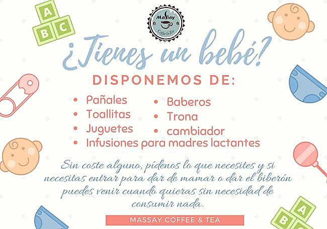 Massay Coffee & Tea cuenta con cambiador, toallitas, pañales y jueguetes para quienes acudan con niños pequeños a su establecimiento