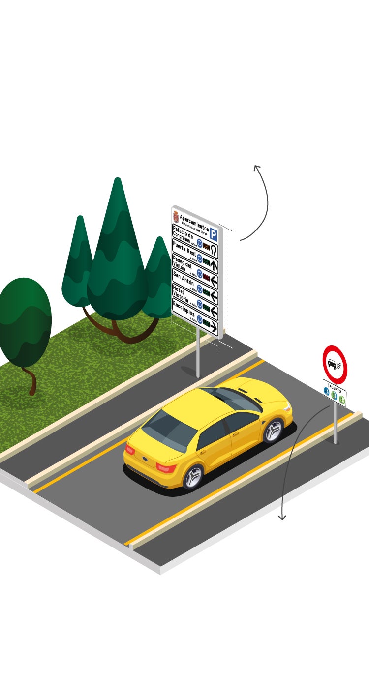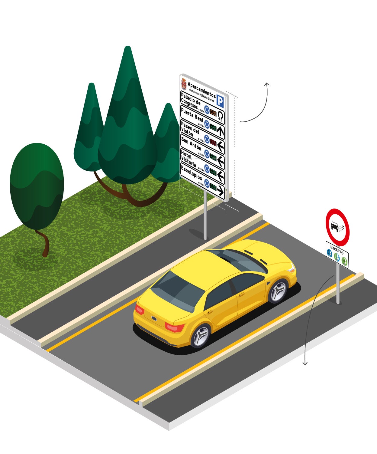 Uno de los problemas de movilidad en la capital es el de los vehículos que se desplazan a la búsqueda de aparcamiento. Dado que el acceso a los parkings estará permitido, los conductores tendrán que saber de antemano, antes de entrar a la ZBE, si tienen plazas disponibles. Para solucionarlo, habrá 16 paneles informativos con señales que mostrarán a tiempo real las plazas libres en los parkings más cercanos. Señalarán con indicadores verdes las zonas de aparcamiento que tengan más de medio centenar de plazas libres. Con leds de color naranja aparecerán los que tengan entre 20 y 50 espacios disponibles. Por último, en rojo figurarán los que tengan menos de una veintena de plazas.