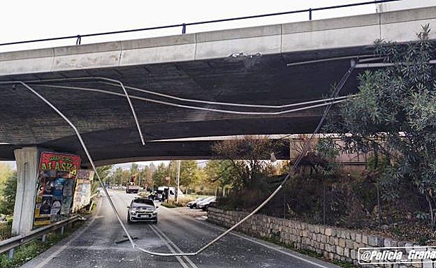 Un camión choca contra un puente de la Circunvalación en Granada y lo rompe
