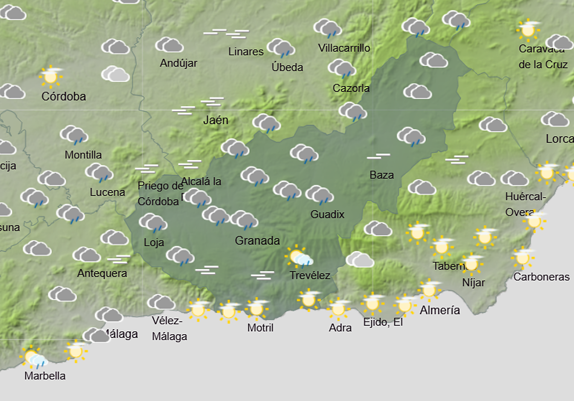 De este modo, tras un miércoles que estará marcado por la lluvia y el frío en Granada, el jueves volverá a ser un día de cielos nubosos y precipitaciones. La madrugada y la mañana de dicha jornada serán tranquilas, pero conforme avance el día aumentará la nubosidad y llegará la lluvia. De hecho, a partir de mediodía lloverá en toda la provincia menos en la costa.