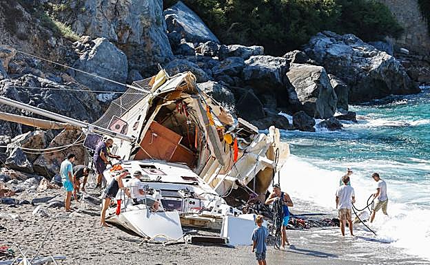 El oleaje parte por la mitad el velero encallado en la Punta de la Mona de La Herradura
