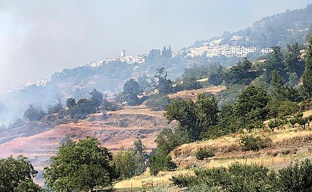 El incendio forestal de Bubión sigue activo, pero debilitado por el ataque de catorce helicópteros y aviones