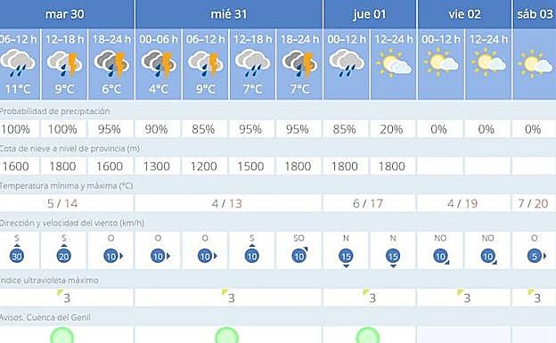 Una situación que mejorará levemente de cara al miércoles en la Costa Tropical pero que se mantendrá muy similar en el resto de la provincia. Con posibilidad de lluvias generalizadas y tormentas que llegarían sobre todo en la comarcas de Guadix, Loja y en la Vega de Granada.