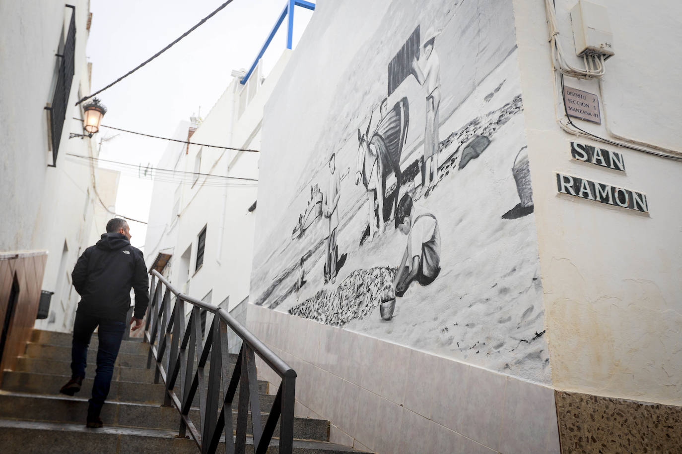 Un poco más arriba, en la cuesta Peralta junto a la calle Ramón, otro mural costumbrista se extiende a lo largo de las paredes de una escalera y adorna los muros blancos de los hogares de los herradureños que viven en el pueblo. El dibujo ilustra el proceso de carga que realizaban los pescadores con todo el género sobre los mulos, para posteriormente llevarlos para la venta.