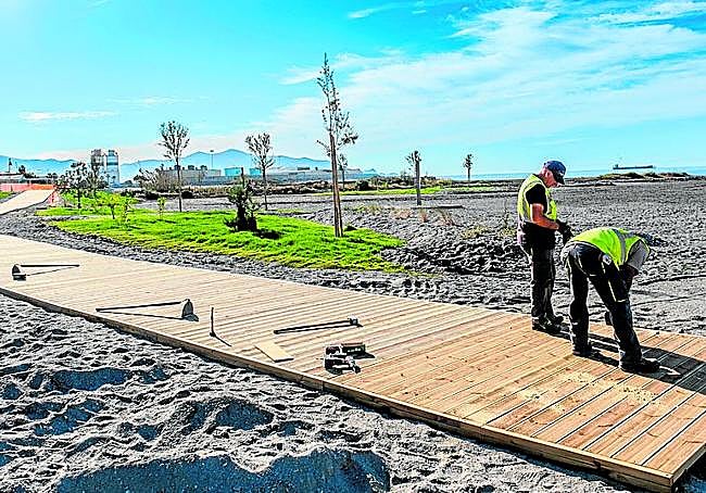 En la explanada donde hasta ahora se acogía una zona de aparcamiento de vehículos, entre el chiringuito Bonobo y la zona donde están instaladas las redes de voley de la playa de Los Moriscos, se está abriendo camino un espacio verde de más de 6.500 metros cuadrados en primera línea de playa. Un gran parque frente al mar. Los coches se moverán a otra zona y este espacio con vistas a la playa será ahora para el disfrute de los ciudadanos.