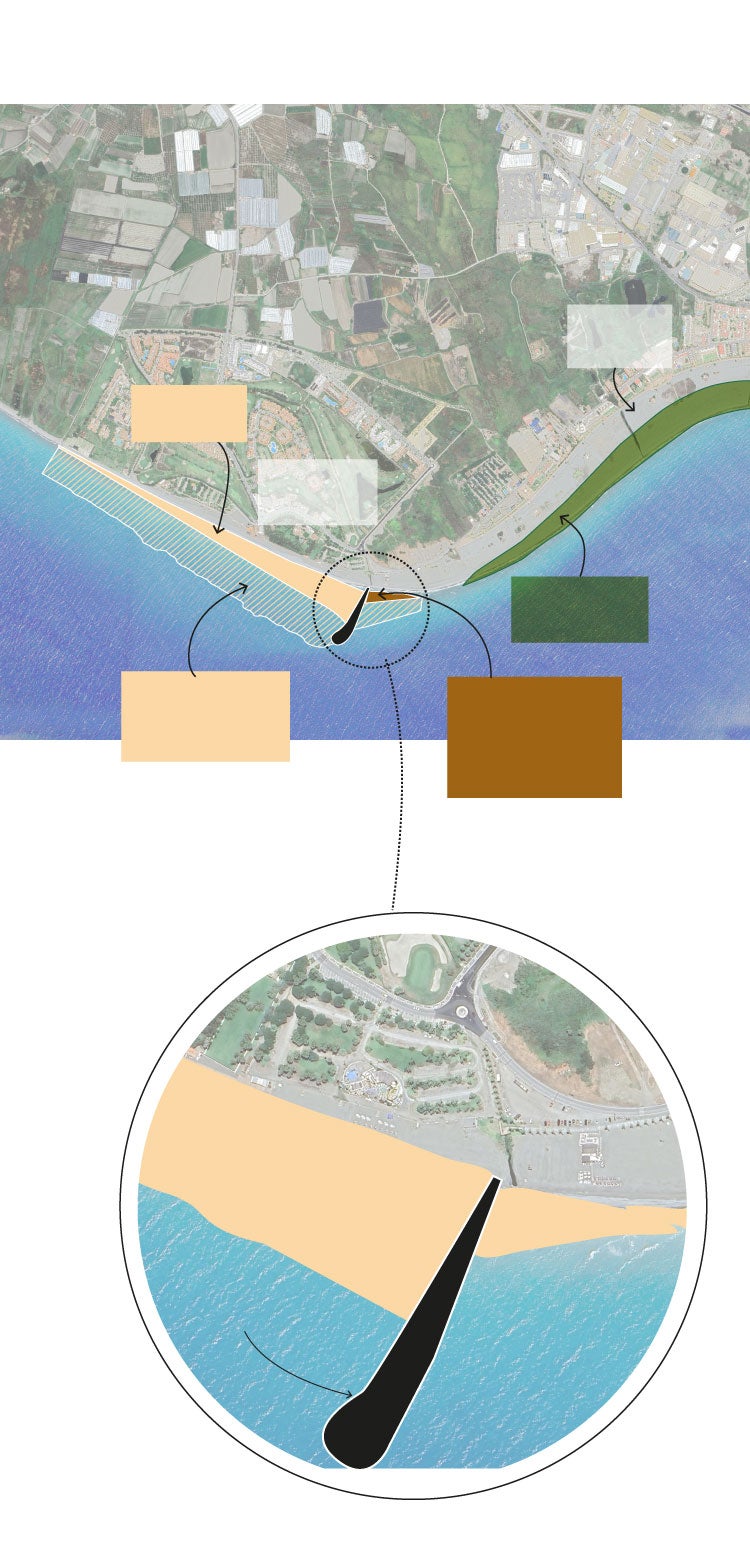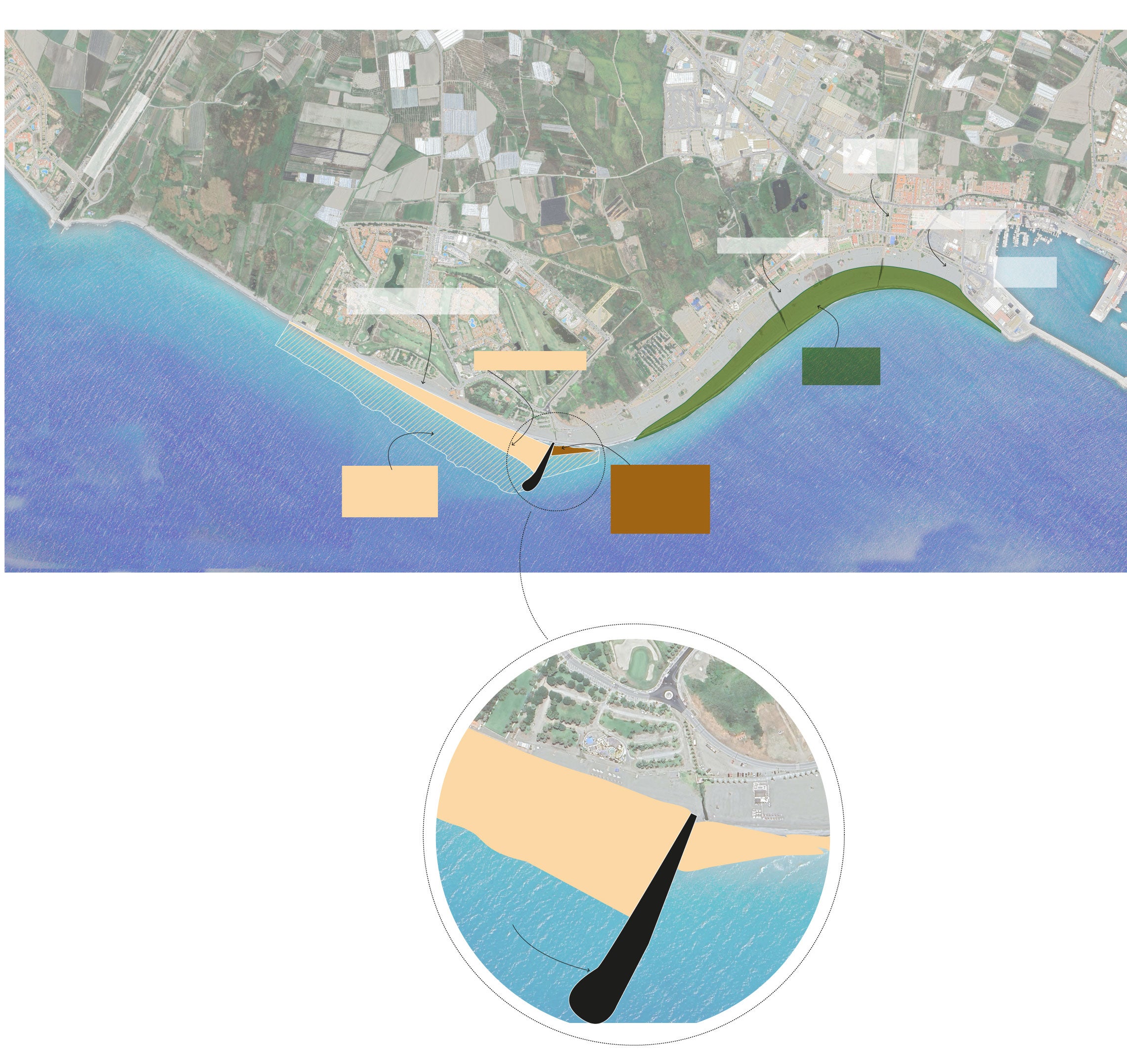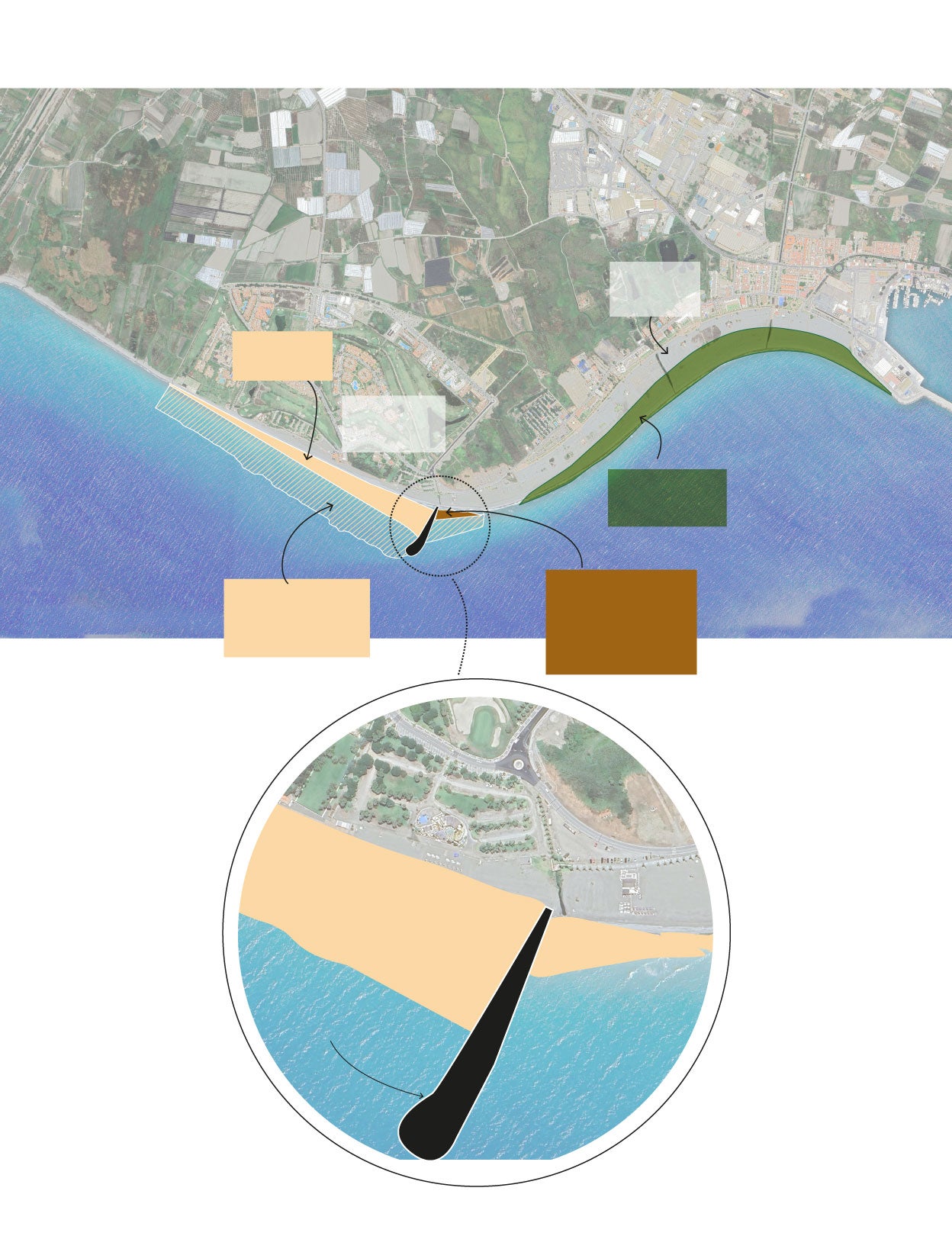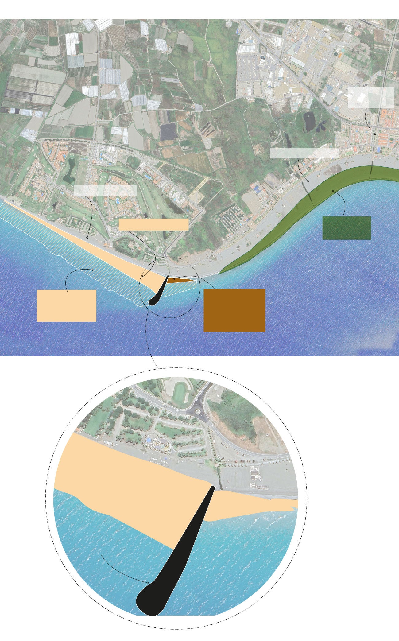 De todas las opciones planteadas, la más efectiva para corregir la playa es la construcción de un solo espigón perpendicular a la costa y de unos 247 metros de longitud. La defensa se adentrará en el mar 178,76 metros y se curvará hacia un lado, el lado de poniente con un radio de 75 metros. La infraestructura dificultará así la pérdida de arena.