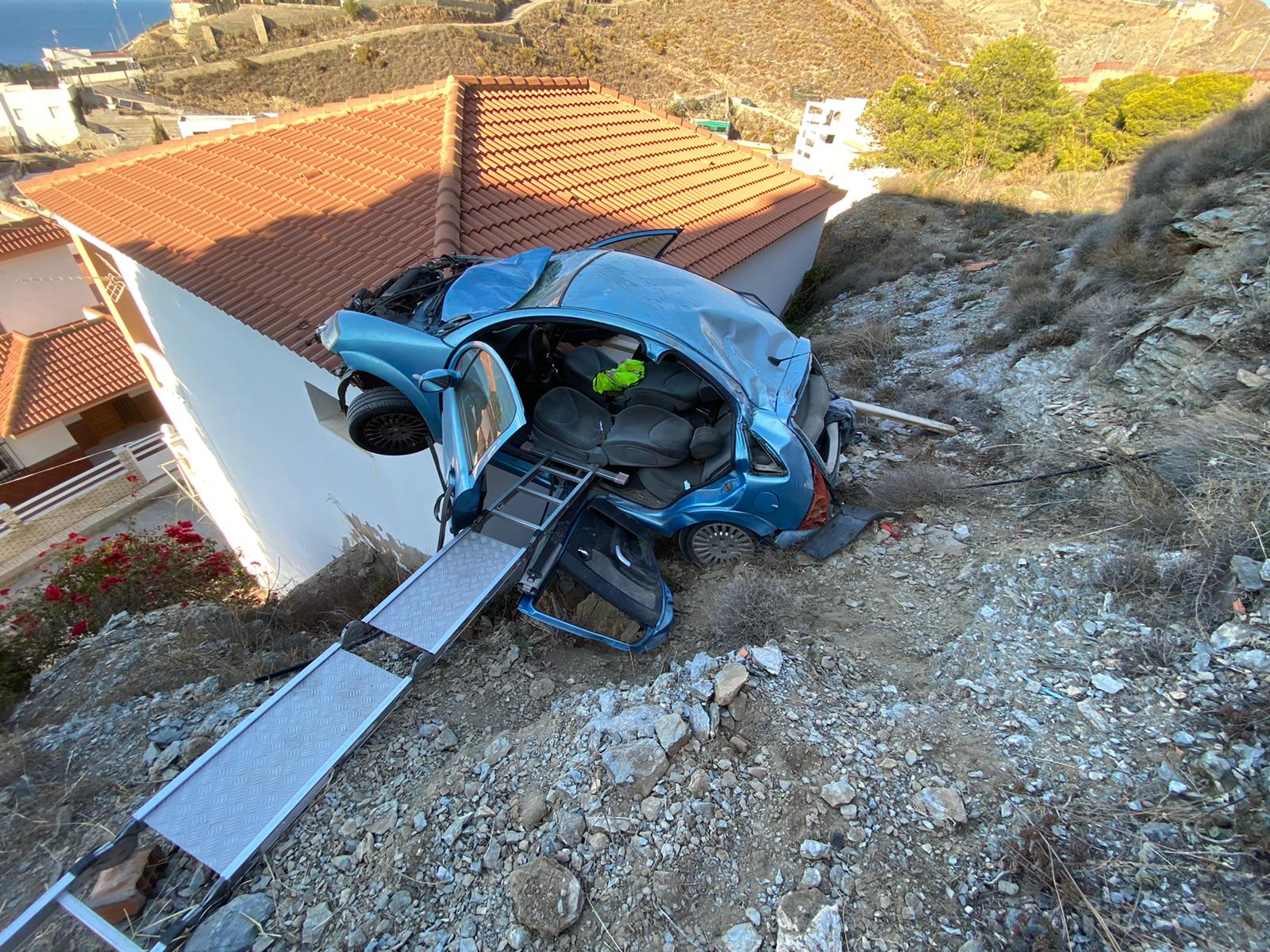 Ante las fracturas que presentaba, ha sido trasladado al hospital de la capital granadina. El vehículo ha tenido que ser rescatado con una grúa de grandes dimensiones, mientras que la vivienda afectada por el suceso ha sufrido algunos daños materiales en el tejado.
