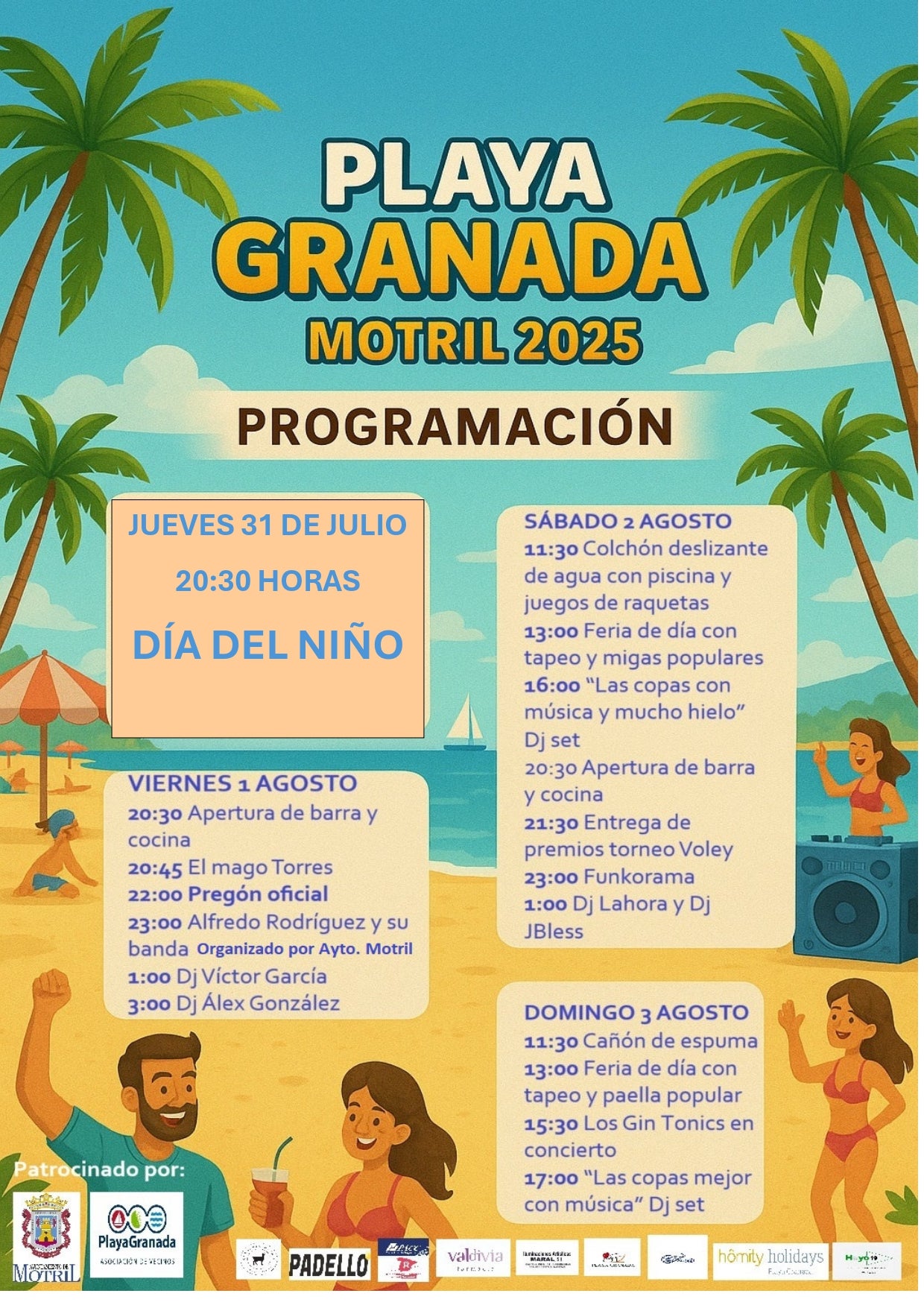 Estas fiestas comenzarán el jueves 31 de julio con una jornada muy especial dedicada a los más jóvenes con el Dia del Niño. El viernes 1 de agosto, el programa de fiestas dará comienzo con toda la programación abriendo barra y cocina a partir de las 20:30 horas y con la actuación del Mago Torres, todo previo al pistoletazo de salida de las fiestas con el pregón oficial a las 22:00 horas. Una vez finalizados estos actos, será el momento de disfrutar de la noche con la música de Alfredo Rodríguez y su banda, organizado por el Ayuntamiento de Motril, así como las sesiones de los DJ Víctor García y Alex González.