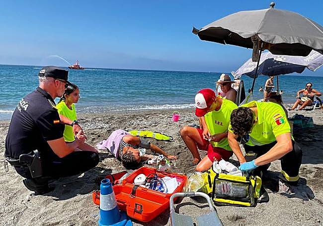 Los servicios de emergencia recrean un simulacro de evacuación en caso de incendio de una embarcación en la playa motrileña