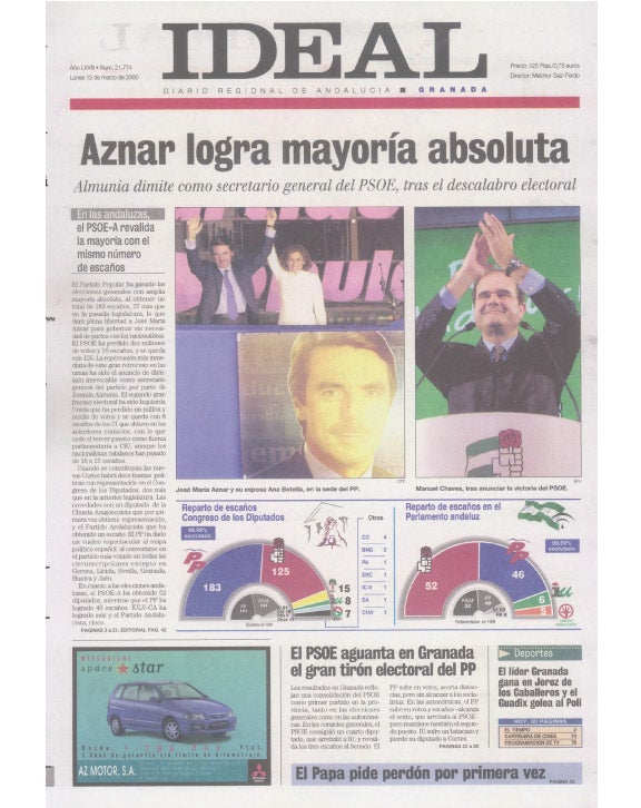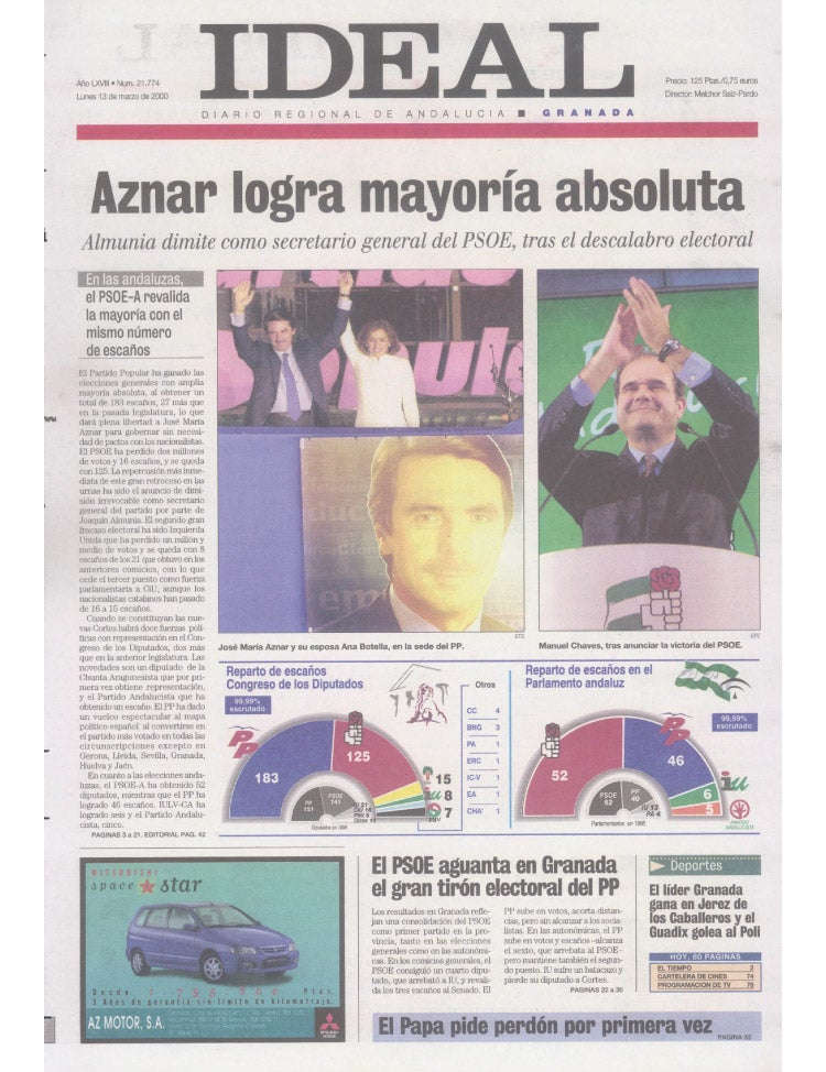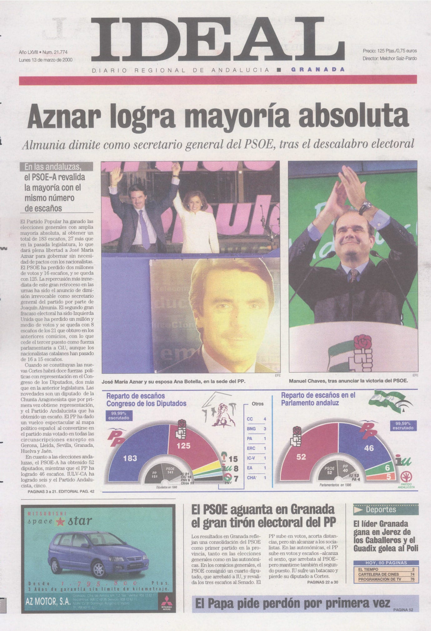 El año 2000 estuvo marcado en lo político por la segunda victoria de José María Aznar en las elecciones generales, en aquella ocasión por mayoría absoluta. No mucho después llegarían los atentados del 11-S y la entrada de España en la guerra de Irak, que acabarían enfrentando a su Gobierno con la mayor parte del país. Con posterioridad, los atentados del 11-M y su gestión de aquella crisis le acabarían costando las elecciones. Pero en marzo de 2000 todavía eran todo alegrías.