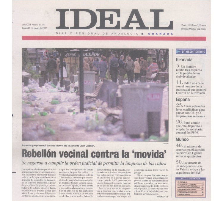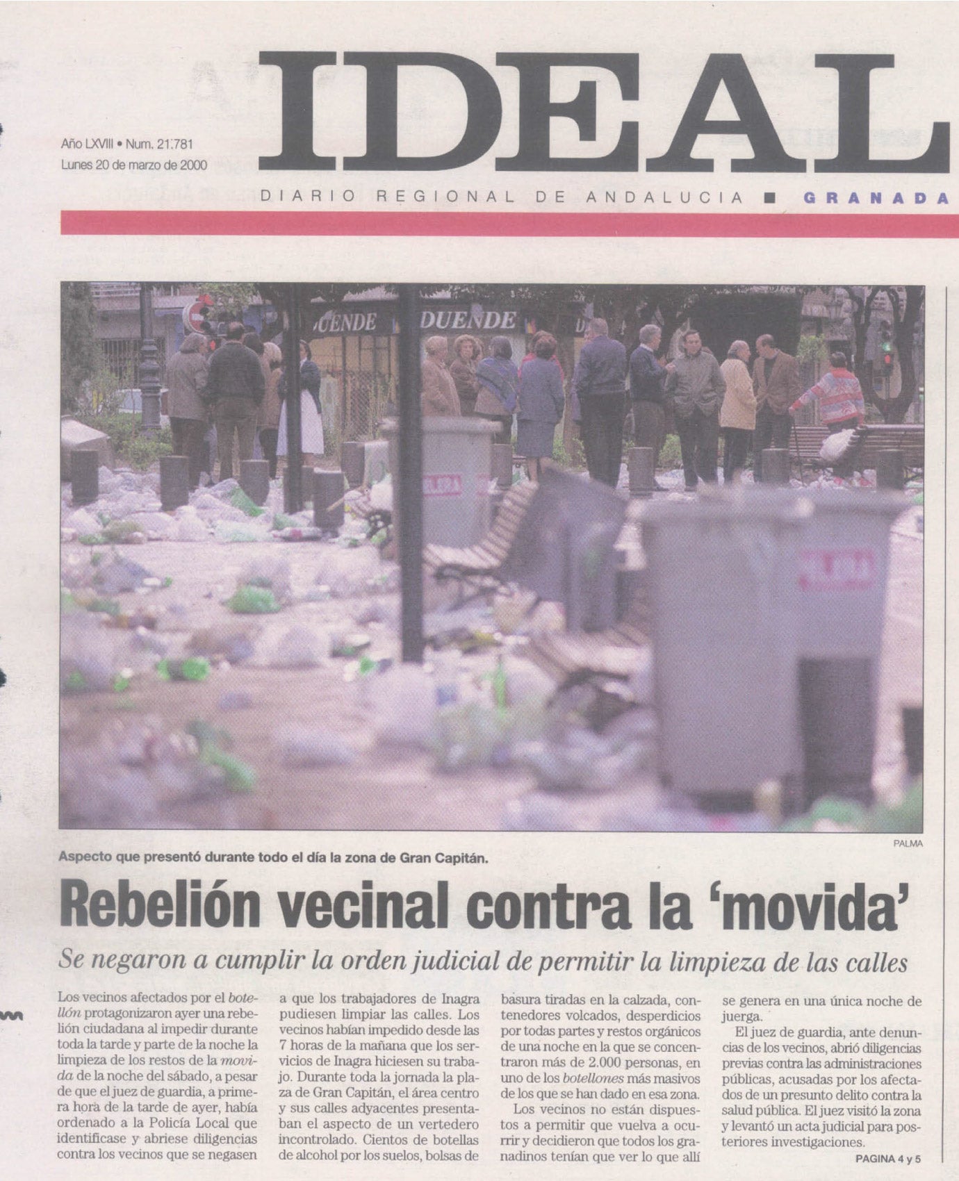 También es hoy bastante menos preocupante el asunto del botellón, que en aquel momento tenía en pie de guerra a parte de la ciudad, como a parte de los vecinos de la zona de Gran Capitán y otras afectadas por lo que entonces se llamaba 'movida'. Fueron múltiples las soluciones que se plantearon, aunque al final la que prosperó fue el traslado al 'botellódromo' de Méndez Núñez. También se creó aquel año la plataforma contra este fenómeno, que llegó a hacer un escrache en casa del alcalde de la capital. Hoy en día es un problema mucho menos prevalente que hace unos años, circunscrito sobre todo a festividades concretas, como el Día de la Cruz.