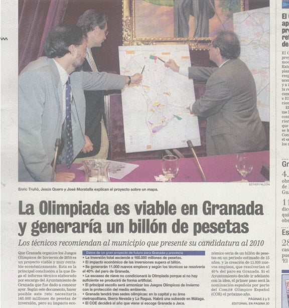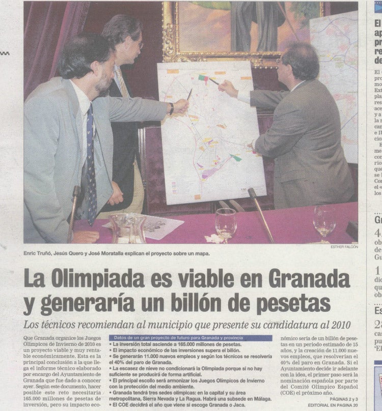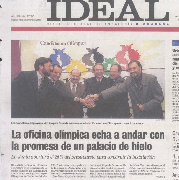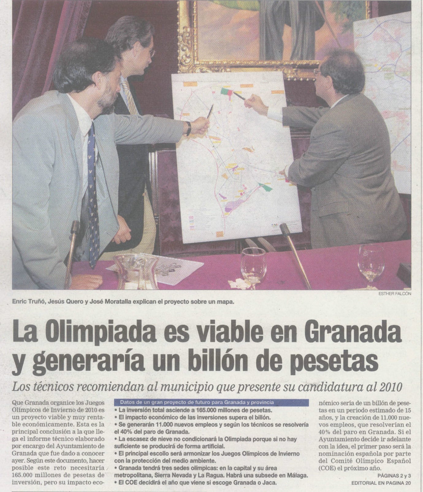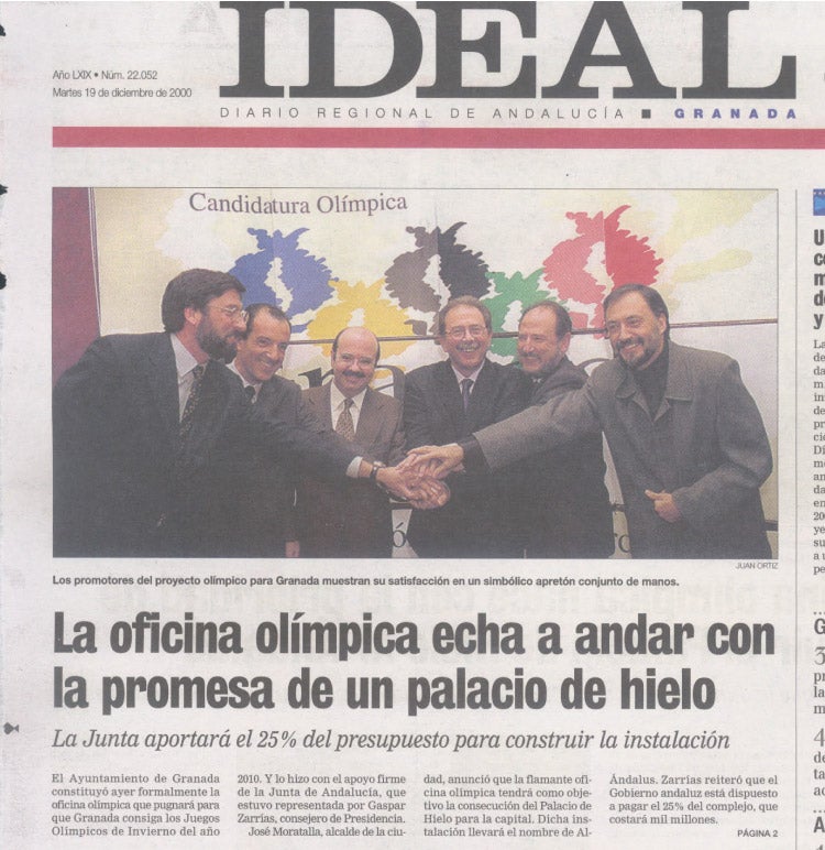 Otros grandes proyectos que destacaron entonces no tuvieron tan buen fin. El más destacado de ellos es la intentona olímpica de Granada. En concreto, la candidatura fallida a los Juegos Olímpicos de Invierno de 2010. No se aprendieron aquí lecciones del pasado, ya que en hasta dos ocasiones previas, en 1976 y 1992, se había intentado sin éxito hacer lo mismo. El entonces alcalde de la capital, José Moratalla, apostó por una candidatura «viable» y que dejaría ríos de dinero en la ciudad. Lo de siempre. La ciudad elegida acabaría siendo Jaca y, por el camino, Granada habría perdido casi dos millones entre estudios, asesorías, publicidad y viajes.