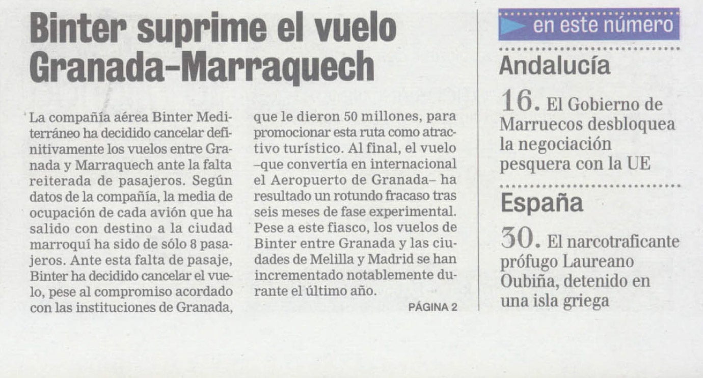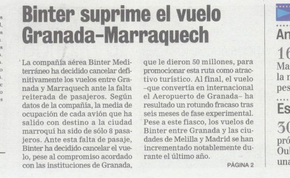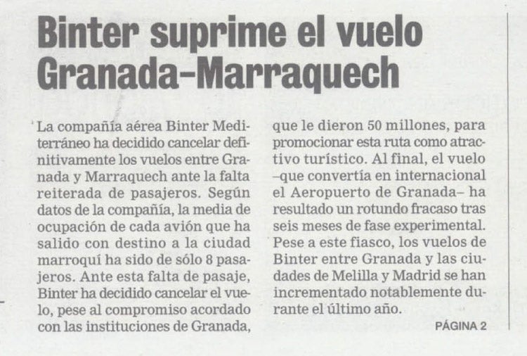 Y los vuelos internacionales, que se habían estrenado ese mismo año, comenzaron a sufrir golpes pocos meses después. El 31 de octubre se publicaba el anuncio de que Binter suprimía «el vuelo Granada-Marraquech». El vuelo, dijo IDEAL, había resultado «un rotundo fracaso». Hoy, Granada vuelve a quedarse muy cerca de dejar de ser de nuevo un aeropuerto con conexiones internacionales, ya que, tras el anuncio de la suspensión del enlace con París, la única ruta activa es la que la une el Federico García Lorca con Ámsterdam.