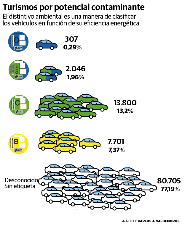 La cifra para la esperanza es la relativa al registro de coches no contaminantes. Las estadísticas distribuidas por el Área de Movilidad, referentes a los vehículos con etiqueta ambiental –80.705 quedan fuera de la base de datos– muestran que un 9,9% de los turismos tienen 'pegatina' cero o ECO. Estos distintivos identifican a los coches con motor eléctrico, híbridos o impulsados por gas natural o gas licuado del petróleo.