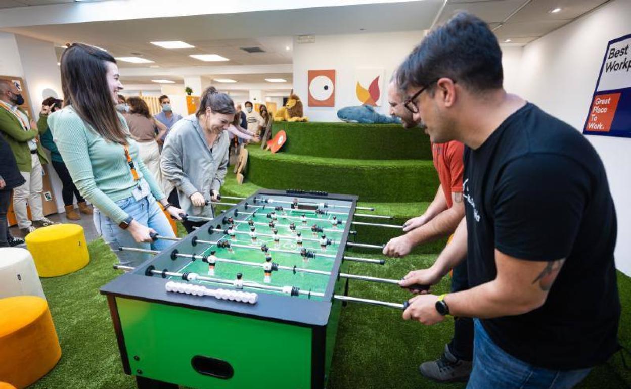 A las cinco y media de la tarde se apagan las luces de la oficina y no queda nadie en la quinta planta de Gran Vía, 16, un oasis laboral de buen rollo decorado con peluches y colores enérgicos. Allí su joven plantilla (la media es de 28 años) combina teletrabajo y presencialidad y se toma respiros en el futbolín o en su terraza con espectaculares vistas de la ciudad.