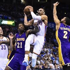 El base logra un 'doble-doble' en la victoria de su equipo ante los Lakers (127-117) que permite a los de Oklahoma City aguantar en puestos de Playoffs