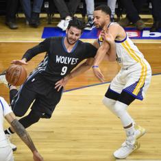 Ricky Rubio disputa el balón con Stephen Curry, de los Warriors.
