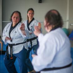 Dice que Nuria «es una profesora simpática, aunque nos da mucha caña, pero eso es bueno porque nos obliga a que nos esforcemos por aprender». Cada tarde, Sonia Mallorquín se enfunda el dobok y se pone a las órdenes de Serra. «A través del taekwondo», ataja la profesora, «trabaja muchos ámbitos como la rutina, la repetición. y eso es bueno porque ha ganado en coordinación. Cuando Sonia empezó apenas era capaz de realizar un movimiento con extremidad derecha e izquierda a la vez, y ahora tiene una coordinación como la mía», explica.