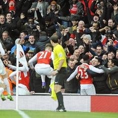 El Arsenal logró una victoria agónica ante el Leicester, que jugó casi toda la segunda mitad con un hombre menos, y vio cómo los gunners les superaban en la última jugada con un gol de Danny Welbeck. El Leicester se adelantó (minuto 45) con un gol de su delantero, y máximo realizador del campeonato, Jamie Vardy, al transformar un penalti que significó su gol 19ª en la Premier. Los cambios realizados por el técnico local, el francés Arsene Wenger, surtieron el efecto deseado, ya que los dos goles del Arsenal los anotaron atacantes que salieron desde el banquillo.