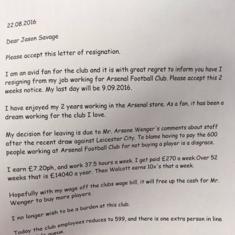 Soy un apasionado seguidor del Arsenal y con mucha tristeza les informo que he renunciado de mi posición como empleado del club de fútbol. Les ruego acepten mi renuncia que tendrá vigencia a partir de las próximas dos semanas. Mi último día será el 09.09.16.