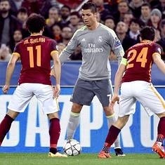 La escuadra 'giallorossa' también comenzó con las líneas avanzadas para dificultar que Kroos y Modric jugasen fácil y montaran peligrosas transiciones. Pero enseguida se replegó para juntar líneas y organizar rápidas salidas al contragolpe. Para eso alineó Spaletti un once con más músculo que técnica en el que se echaba de menos a De Rossi, recién salido de una lesión, y a un ariete típico del perfil del bosnio Dzeko. Ambos salieron a escena cuando su equipo ya perdía. Tampoco estaba el veterano Totti, que calentó banquillo en una cita grande, cerca ya de los 40. Con Pjanic, Vainqueur y Nainggolan en el eje del centro del campo, los locales lograron cortocircuitar muchos minutos a los merengues, con serias dificultades para poder enlazar con sus delanteros. Y con la velocidad del egipcio Salah y del exmilanista El Shaarawy, les ganaron la espalda a los los laterales del rival, muy ofensivos y con Marcelo de vuelta pese a su reciente luxación de hombro. El exsevillista Perotti, ejercía de '9' mentiroso. Y apenas intervino.