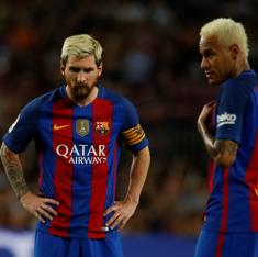 Messi (i) y Neymar, después de un gol del Alavés.