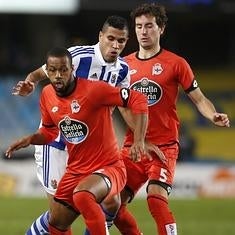 El delantero brasileño de la Real Sociedad Jonathas (c) pelea un balón con Mosquera (d) y el brasileño Sidnei (i), ambos del Deportivo de La Coruña.