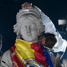 Con micrófono en mano el capitán dirigió 23 minutos de celebración en la pasarela, alrededor de la fuente, que culminaron con Ramos y Marcelo dejando una bandera de España con el escudo del Real Madrid en el cuello y una bufanda en la cabeza, respectivamente, a una diosa que ambos besaron.