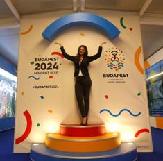 Una turista posa en el logo de la candidatura olímpica de Budapest.