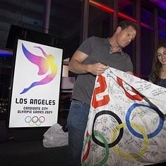 Además del eslogan "Seguir el sol" ("la estrella de nuestra ciudad"), el alcalde de Los Ángeles Eric Garcetti insistió en el hecho de que "un 90% de las infraestructuras deportivas están ya construidas".