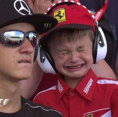 Justo mientras Räikkönen dejaba su coche aparcado con una suspensión rota, las cámaras se centraban en un punto de la grada, donde un niño ataviado de arriba abajo con la ropa roja de Ferrari y unos grandes cascos blancos para proteger sus oídos del ruido, lloraba desconsoladamente. Había roto su ídolo, y se iba a quedar sin poder verle. Esa imagen ya estaba dando la vuelta al mundo. Cuando Vettel adelantó a Bottas, las cámaras se centraron de nuevo en él, y esta vez estaba dando saltos de alegría.