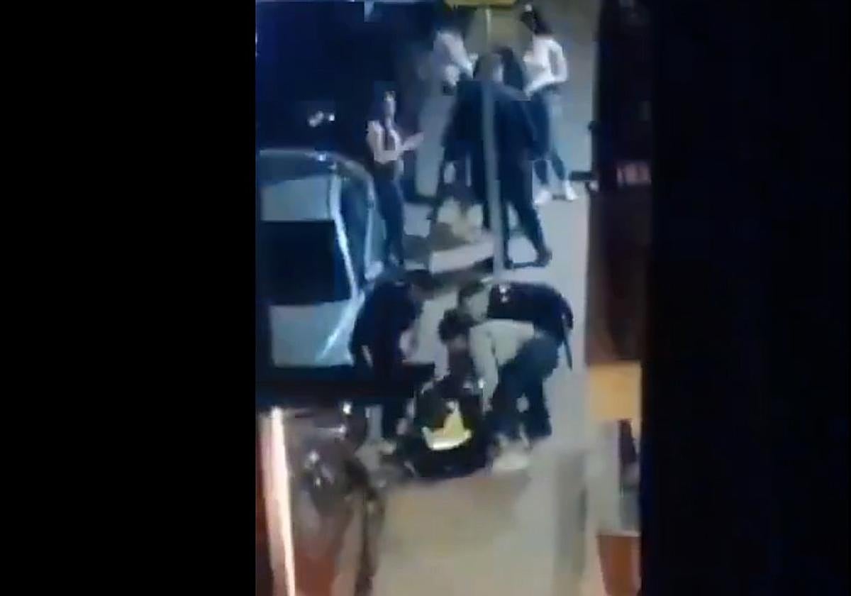 También se aprecia cómo una de los individuos supuestamente involucrados en la riña causa daños en coche aparcado junto al establecimiento de ocio al patear con rabia la carrocería.