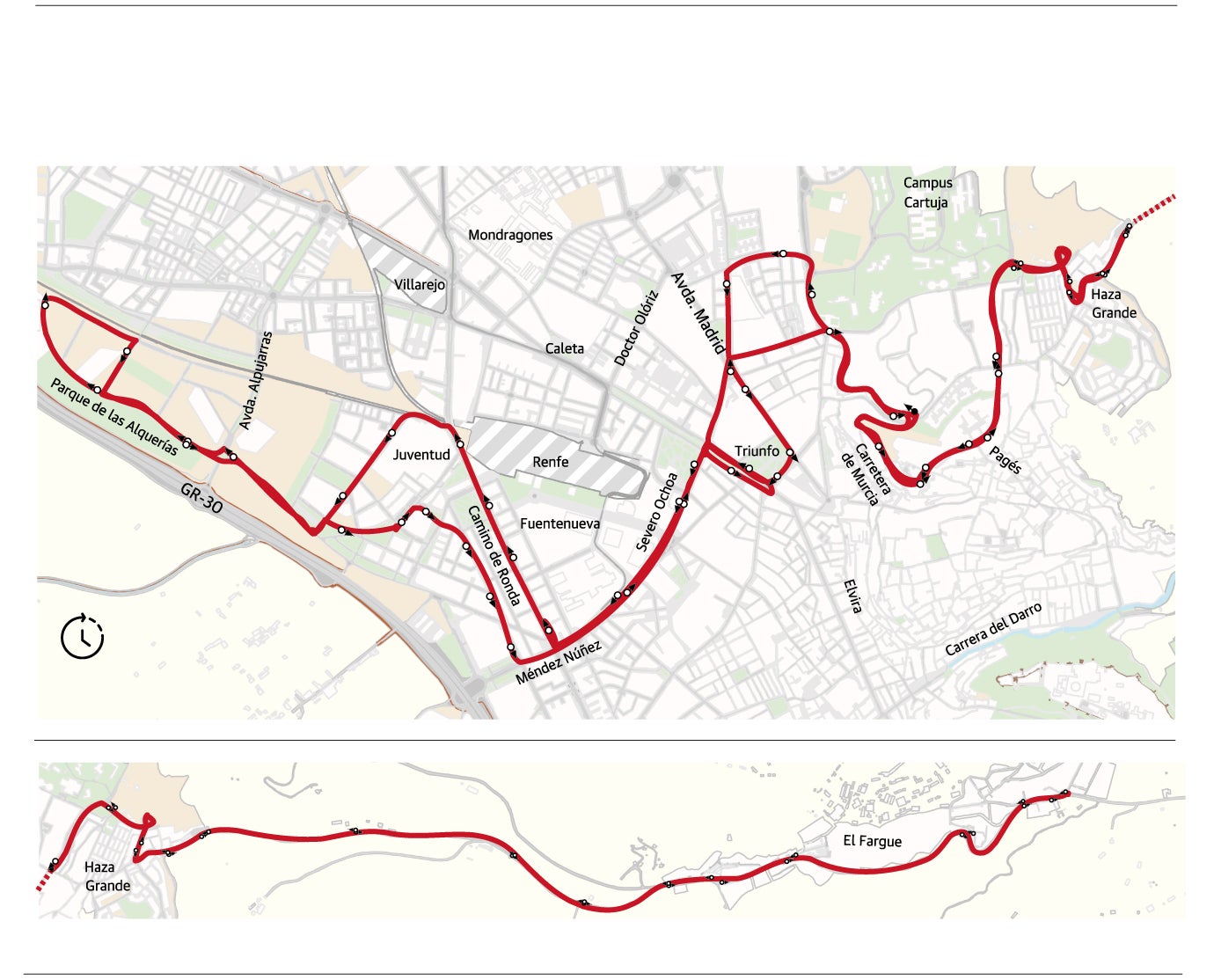 La ruta 7, que empezará a funcionar el próximo 24 de junio, es el resultado de la fusión de la 25, que prestaba servicio entre el gimnasio Ágora We y la calle Gran Capitán, y la N8, que llegaba hasta Haza Grande y El Fargue desde el Triunfo