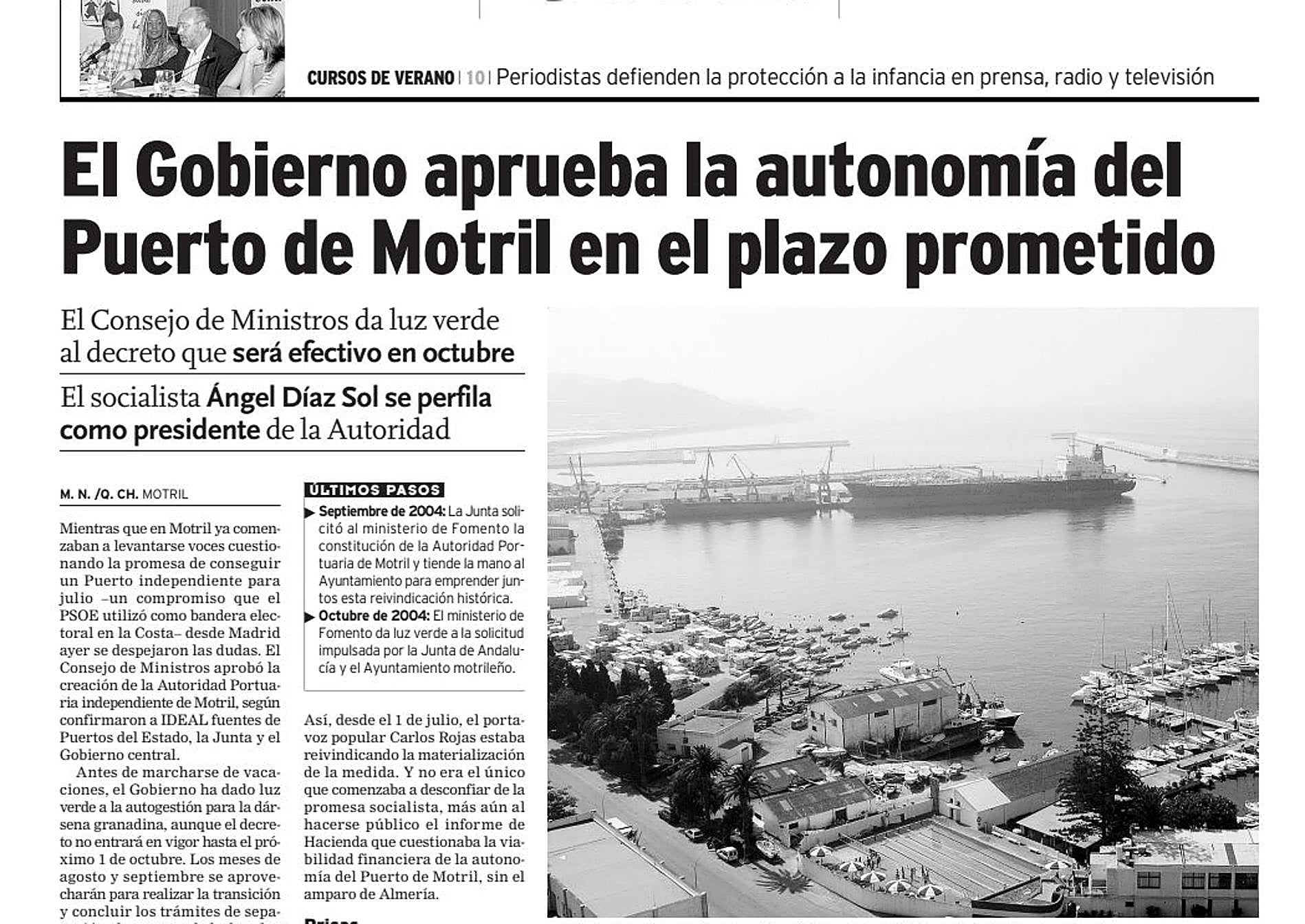 Sobre la campana, en el verano de 2005, cuando se iba a cumplir la fecha prometida, el Gobierno daba luz verde a la autogestión para la dársena granadina, aunque el decreto de autonomía no entraría en vigor hasta el 1 de octubre. El honor de convertirse en el primer presidente del puerto de Motril lo tuvo un histórico del PSOE granadino, el desaparecido Ángel Díaz Sol, (Madrid, 1946, Granada 2023), que cumplía el perfil de los 'guerristas' al frente de los puertos.