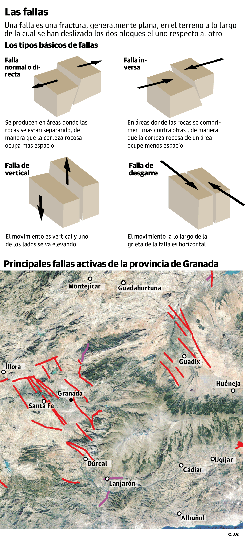El punto en el que chocan las placas tectónicas que separan Europa y África se desplaza cinco milímetros al año. Aunque el movimiento es pequeño, «al tratarse de masas tan grandes» la deformación activa «se deja notar» sobre la superficie, tal y como explica Ana Crespo-Blanc. Dicho movimiento es el que está generando el enjambre sísmico de estos días en las zonas de Santa Fe y Atarfe. El suelo se mueve por una familia de fallas que se sitúan en la zona sur-oeste de Sierra Elvira, colindante con Santa Fe, y en la región izquierda de esta misma cadena montañosa, pegando a Atarfe. Por suerte, las fallas existentes en esta zona «son cortas», por lo que, generalmente, «dan lugar a terremotos de poca magnitud».