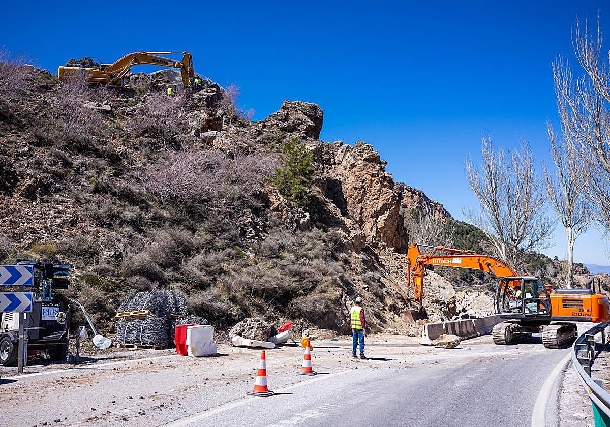 Hace un mes, el 9 de marzo a eso de las ocho de la tarde, la montaña se abalanzó sobre la carretera en el punto ... kilométrico 21,9 de la A-395. Afortunadamente, las grandes rocas que cayeron a la calzada no alcanzaron a ningún coche. Desde ese momento comenzaron unas obras de emergencia para frenar la ladera. Inicialmente los trabajos se ejecutaron con un solo carril de la vía cortado y el tráfico con paso regulado por un semáforo.