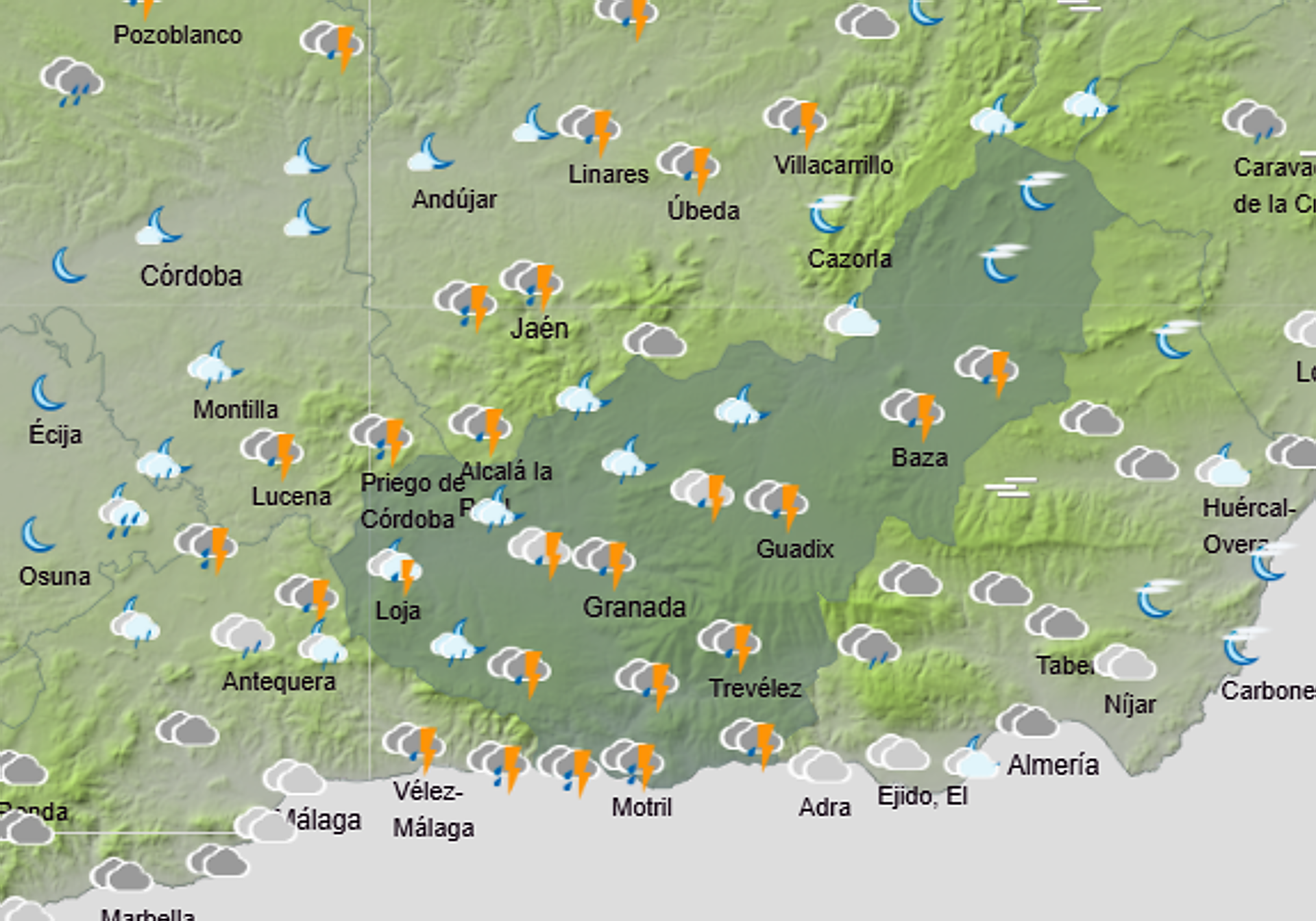 Durante noche, tal y como muestra el pronóstico de la Agencia Estatal de Meteorología (Aemet), las tormentas serán más intensas. Una situación que se extenderá también durante la madrugada del jueves, donde la lluvia continuará siendo la principal protagonista en la provincia.