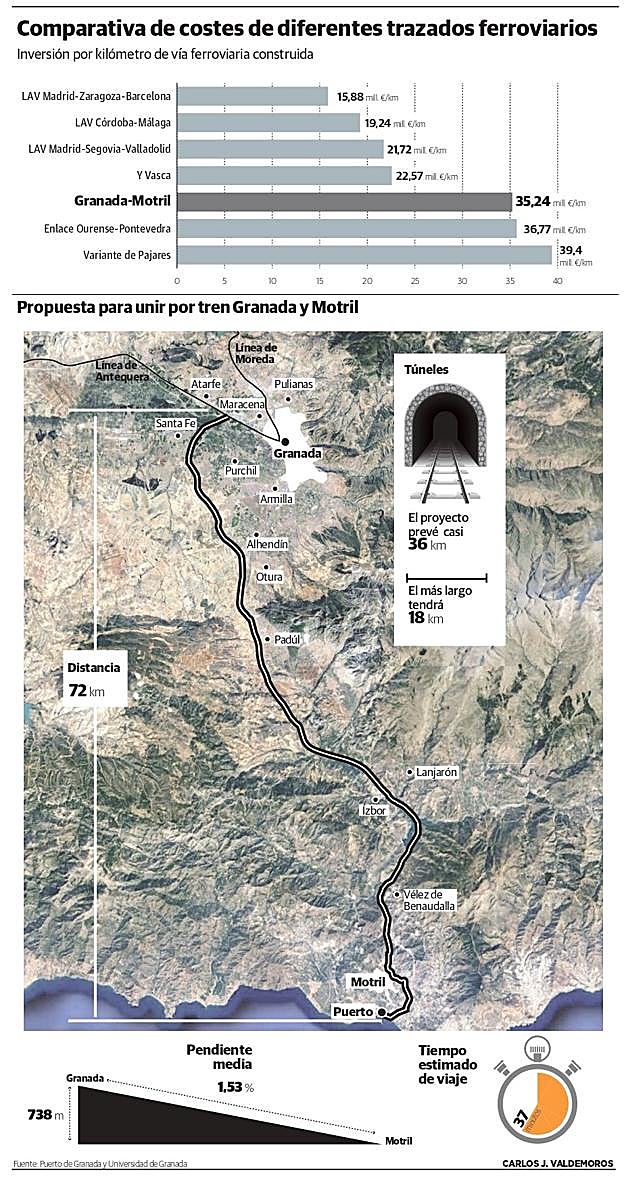 En relación con la conexión Granada-Motril, se indica que la Autoridad Portuaria de Motril contrató con la Universidad de Granada el desarrollo de un estudio de viabilidad para la conexión ferroviaria. Dicho estudio evidencia «las importantes dificultades técnicas que presenta la conexión por la diferencia de cota entre Granada y el puerto» y plantea varias alternativas de trazado con un coste estimado que varía entre los 2.467 y los 2.647 millones de euros en esta primera fase de estudio, según indica el Gobierno en su respuesta, que matiza lo caro del proyecto: «esto situaría el coste de la conexión en el entorno de los 37 millones de euros por kilómetro, de los valores más altos existentes en España», apostilla.