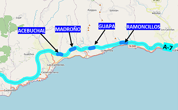 A-44 (Bailén-Motril) entre los kilómetros (km)181,700 y 183,980.A-7 (Algeciras-Barcelona) entre los km 851,830 y 922,520. A-7 Vías de servicio, en varios tramos delimitados entre los siguientes km 883,000 y 885,300; 910,000 y 911,900 y 920,000 y 920,870.GR-14 (Acceso Oeste al Puerto de Motril) entre los km 0,000 y 2,940.GR-16 (Acceso Este al Puerto de Motril) entre los km 0,000 y 3,000.N-323 (Bailén - Puerto de Motril) en varios tramos delimitados entre los siguientes km 18,500 y 189,500; 190,250 y 194,000.N-340 (San Fernando-Barcelona) en varios tramos delimitados entre los siguientes km 302,680 y 355,000; 358,250 y 373,050 y 374,650 y 377,690.N-340A entre los km 354,000 y 359,500.Ramal de enlace entre autovías las autovías A-7 y A-44.Ramal de enlace entre autovías A-7 y GR-14.