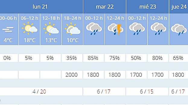 De hecho, el próximo martes se prevén máximas de 17, según pronostica la Agencia Estatal de Meteorología (AEMET), que anuncia una nueva modificación en el tiempo para los próximos días. El lunes, además, se registrán 4 grados de mínima.