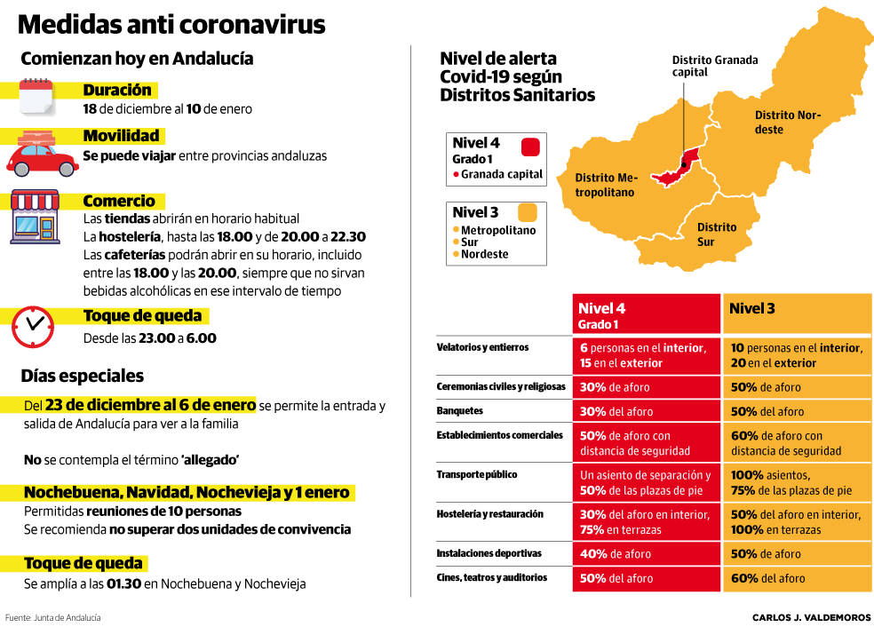 Pero esta relajación en las medidas viene acompañada de otras nuevas que dio ayer a conocer el propio Aguirre. La evolución de la pandemia permite que las restricciones de aforo se rebajen en algunos distritos sanitarios de Granada. El Cinturón y Nordeste pasan a la fase 3 y se suman al área Sur –Costa y Alpujarra–. Entre los cambios que provoca se amplía el porcentaje de ocupación en restaurantes pasando del 30% al 50% en el interior y del 75% al 100% en las terrazas. Y así se extiende a casi todos los ámbitos. Por ejemplo, al transporte público y privado, los gimnasios e instalaciones deportivas o velatorios y funerales, donde también se relajan las limitaciones de aforo: se pasa de seis dentro y 15 fuera, a 10 y 20.