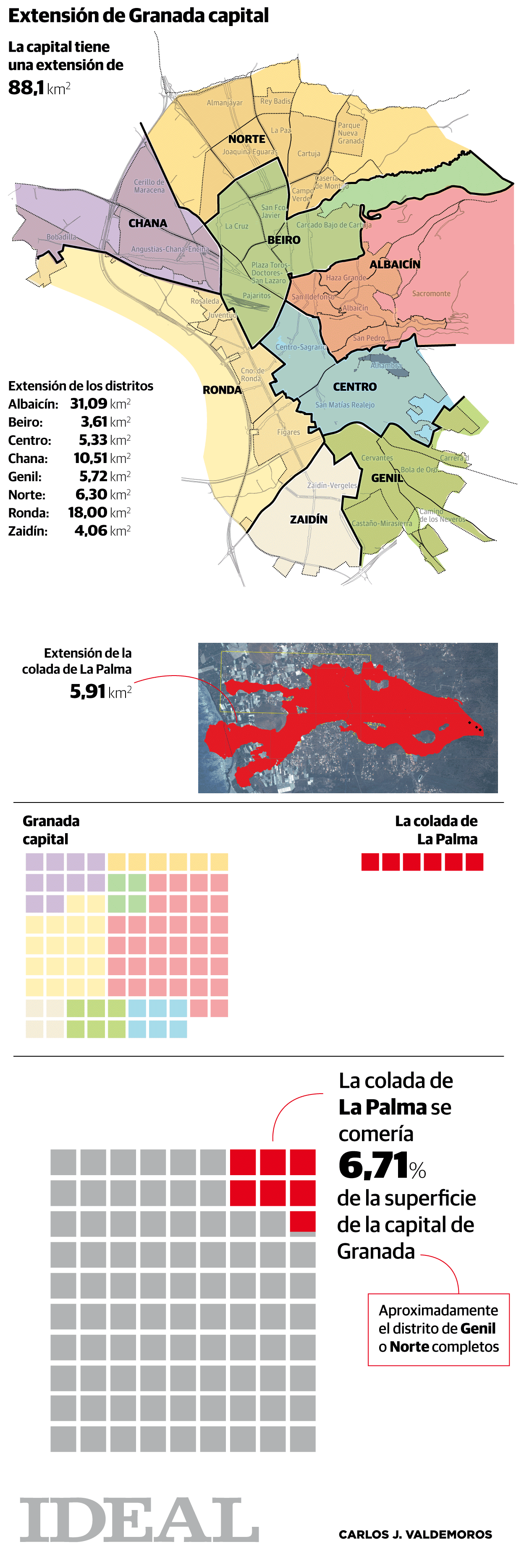 Desde el Llano de la Perdiz hasta el corazón del barrio del Zaidín, lo que incluye la Alhambra, el Generalife, un tercio del Sacromonte, buena parte del Realejo, la Catedral, el Ayuntamiento e, incluso, el parque Federico García. Todo ello quedaría arrasado si en Granada tuviera lugar una erupción volcánica de las mismas dimensiones que la que asola la isla de La Palma. Allí, la colada de lava avanza imparable. El río ígneo se extiende ya por 591 hectáreas, un espacio que partiría en dos a la capital nazarí y destruiría buena parte del centro, además de esterilizar los campos granadinos.