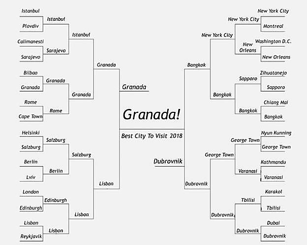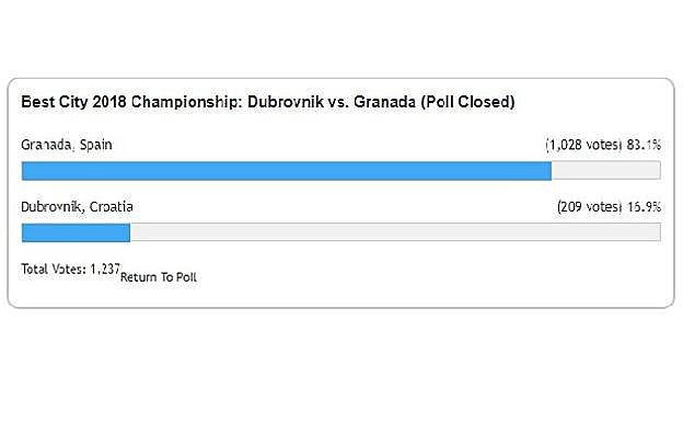 Después de convertirse en 2017 en la ciudad más bella de España, en la ciudad con la Semana Santa más espectacular del país y en el mejor sitio del mundo para visitar, la ciudad de la Alhambra ha vuelto a vencer, tras derrotar a Bilbao, Roma, Estambul, Lisboa y, finalmente, Dubrovnik.