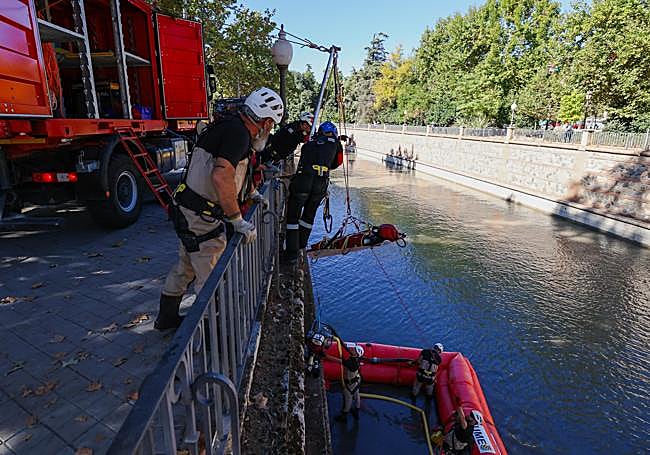 Desde el Paseo de los Basilios, un profesional de la UME realizó el trabajo en vertical. Descendió, izado, hasta el agua y los compañeros que mantenían la barrera de contención le ayudaron a atar bien el cuerpo. Después de varios minutos, y antes de que se produjera la riada, lograron rescatar el cuerpo. El simulacro había acabado. Nuevo éxito para los equipos de Emergencias.