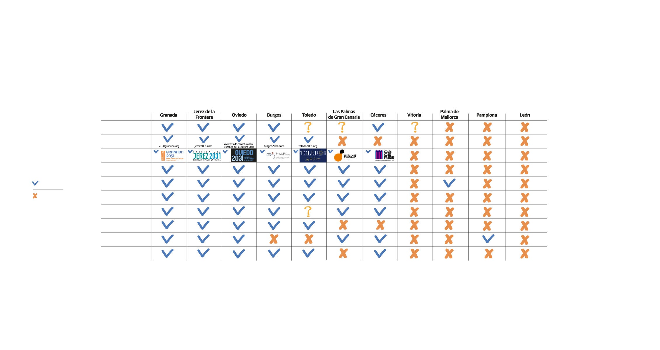 El resto, o sea Vitoria, Palma de Mallorca, Pamplona y León están mucho menos adelantados. En el caso de León, por ejemplo, no cumplen con ninguno de los nueve epígrafes fijados por IDEAL. Es decir, embajadores, página web, logotipo, grupo de trabajo, director/secretario técnico, consorcio/unidad institucional, presupuesto, redes sociales y grandes eventos en el último año. Lo dicho, Granada, Jerez y Oviedo, 'pleno al nueve', y el resto o 'progresa adecuadamente' o está 'estancado'.