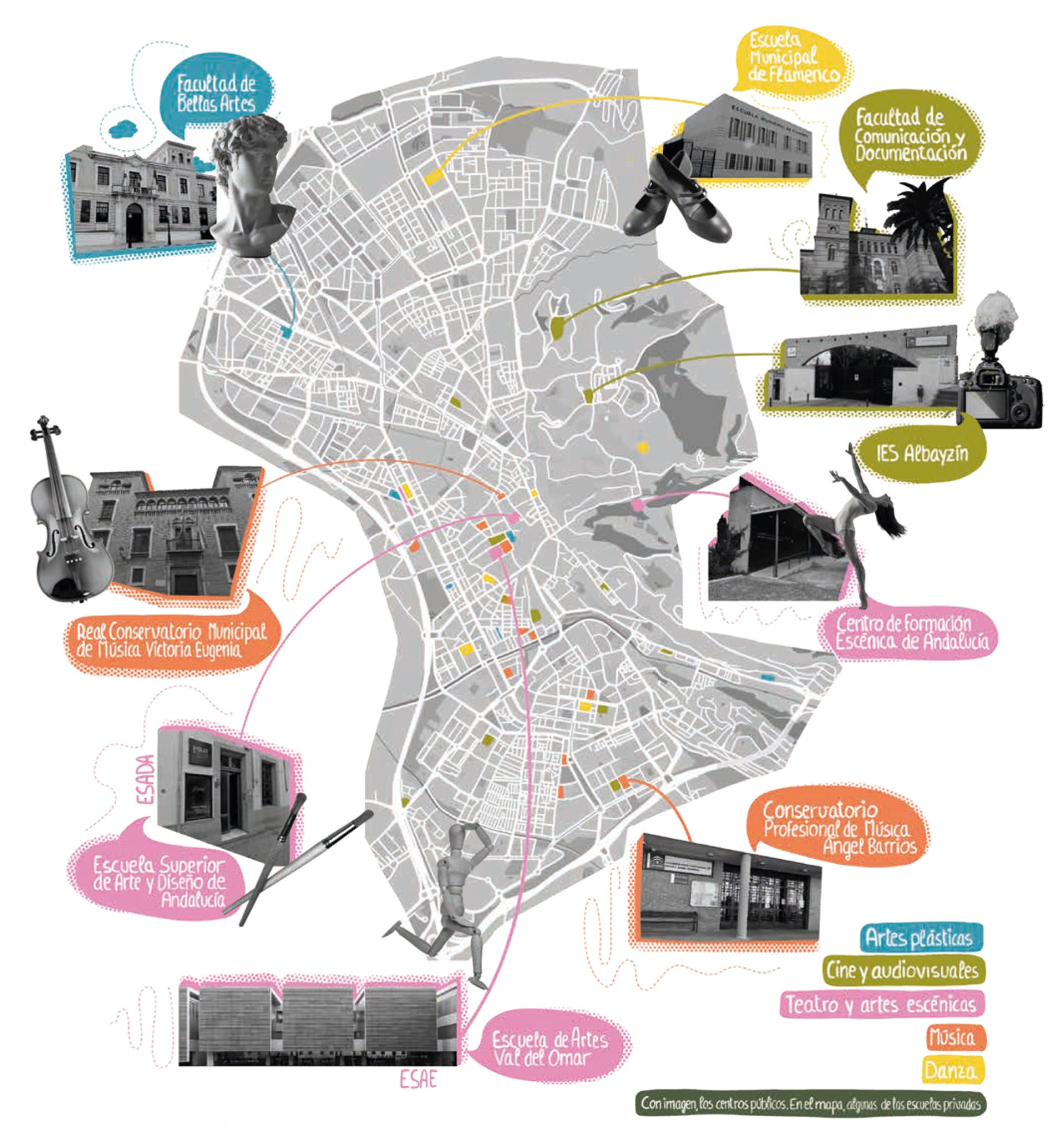 Pero para que todos esos granadinos estén en lo alto y llenen teatros y auditorios, hace falta que la gran fábrica del talento funcione los 365 días del año. Granada dispone de una tupida red de centros de formación, públicos y privados, que se capilarizan hasta la calle más escondida de los barrios de Granada. En todos, sin excepción, encontramos una pequeña escuela de música o una asociación que imparte talleres de pintura para los chiquillos. Aunque en la gran base de esa pirámide encontramos instituciones convertidas, por méritos propios, en grandes referentes nacionales e internacionales. Hablamos de la Facultad de Bellas Artes de la Universidad de Granada, pero también del Conservatorio Superior de Música Victoria Eugenia y los profesionales Ángel Barrios o Reina Sofía, a los que hay que sumar el Instituto Albaicín, el Centro Albaicín, la Escuela de Arte José Val del Omar o el Centro de Formación Escénica de Andalucía.