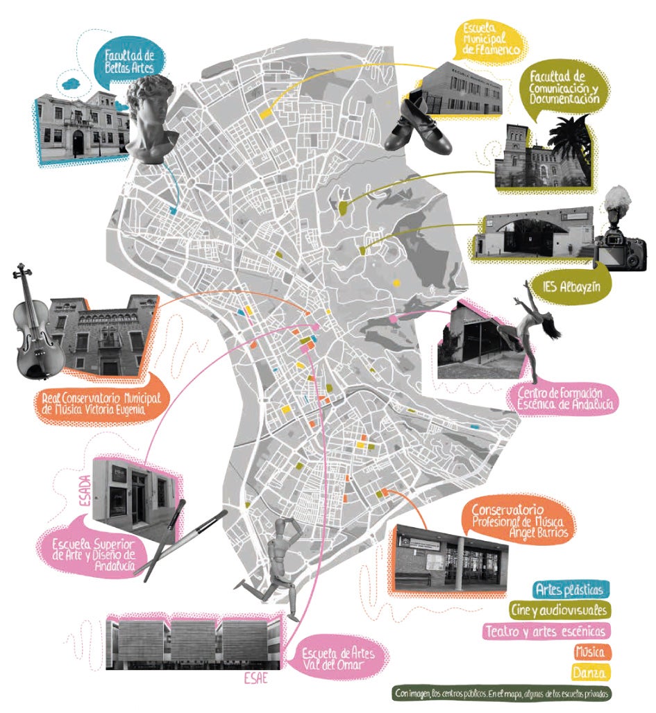 Todos ellos en el ámbito de lo público. Si nos trasladamos a lo privado, el listado sencillamente no tiene fin. Citemos solo unos cuantos. En fotografía la Ampliadora o la Escuela de Arte; en cine Filmosofía, Curva Polar o el IES Soto de Rojas; en moda Estación Diseño; en baile el Carmen de las Cuevas, las escuelas de Lucía Guarnido, Rosa Zárate o Contradanza; en plástica Artemisa, Artegio o Mi Espacio; en música Gabba Hey, Iniciativas Musicales o la Escuela Experimental de Música; en teatro Remiendo, la Escuela de Teatro y Circo o La Carpintería Teatral; y en literatura la Escuela de Escritura o el Taller de Escritores de Granada. Son solo una representación, unos pocos nombres. La relación completa se aproximaría al centenar.