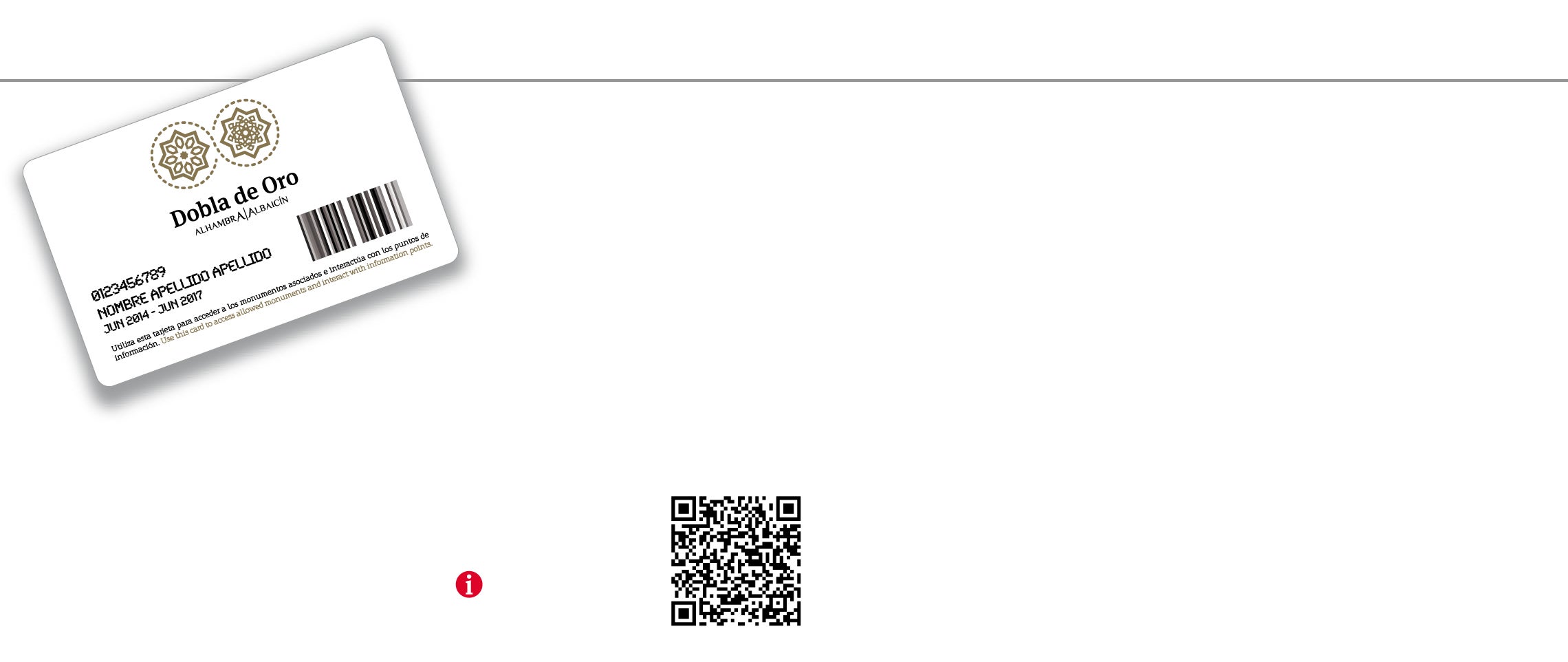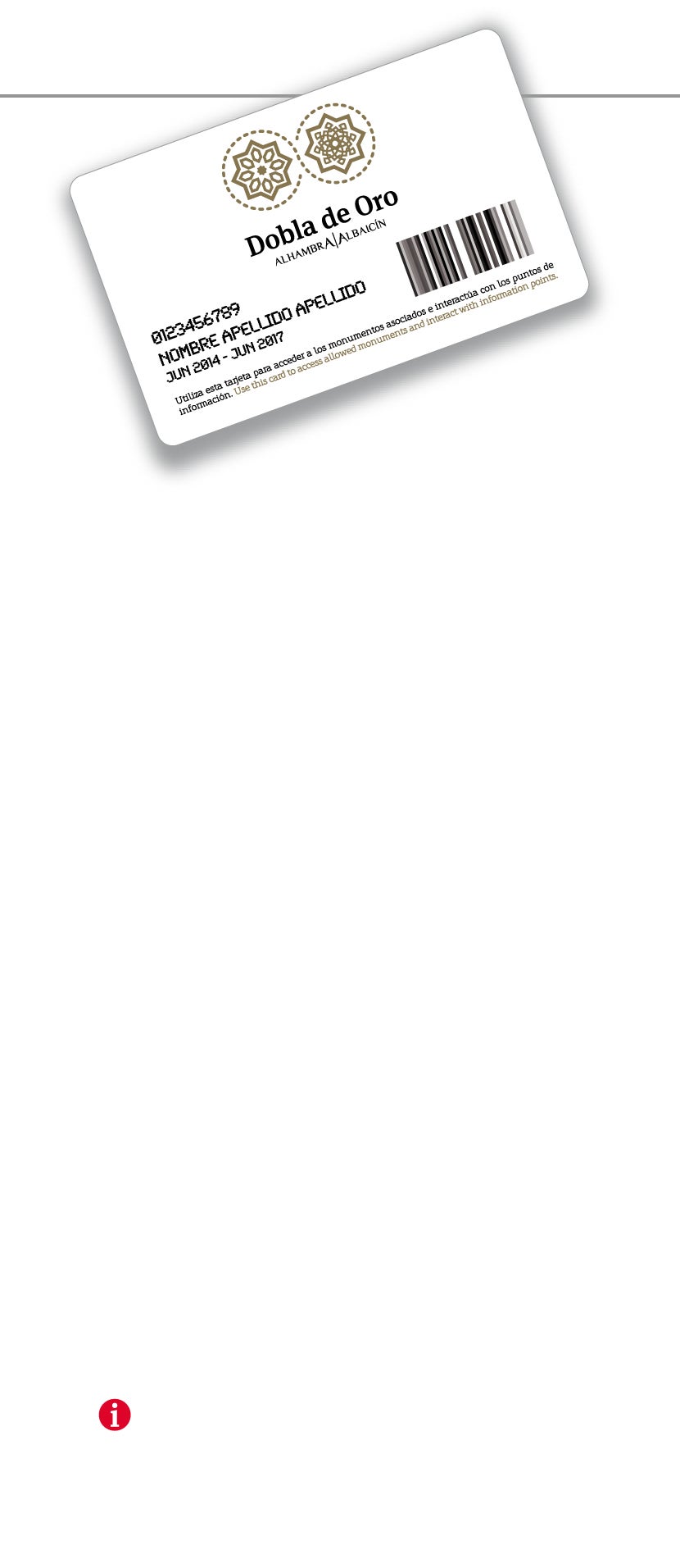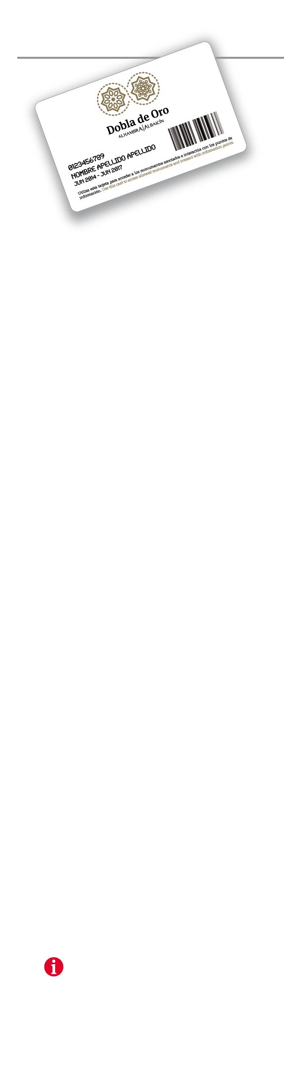 Da acceso a la Alhambra y el Generalife (Alcazaba,Palacios Nazaríes, Jardines del Partal yGeneralife), además de los ocho monumentos incluidos en la Dobla de Oro.
